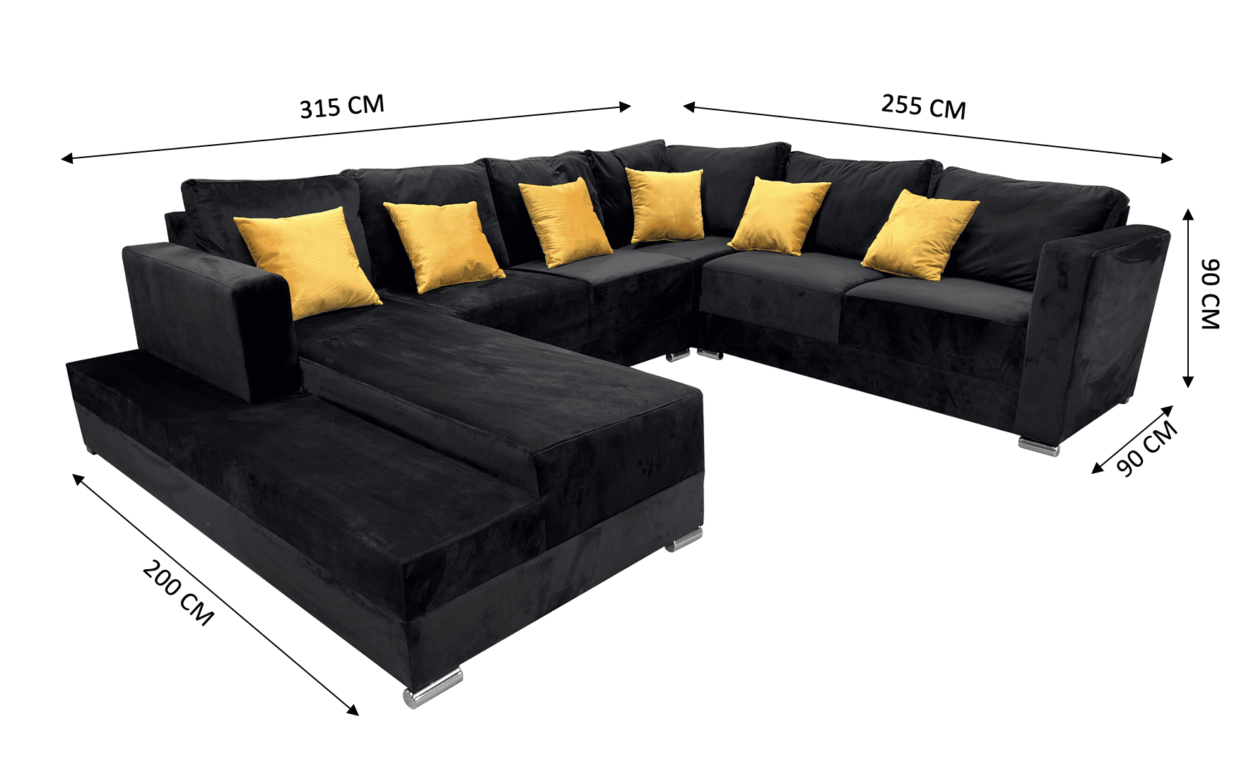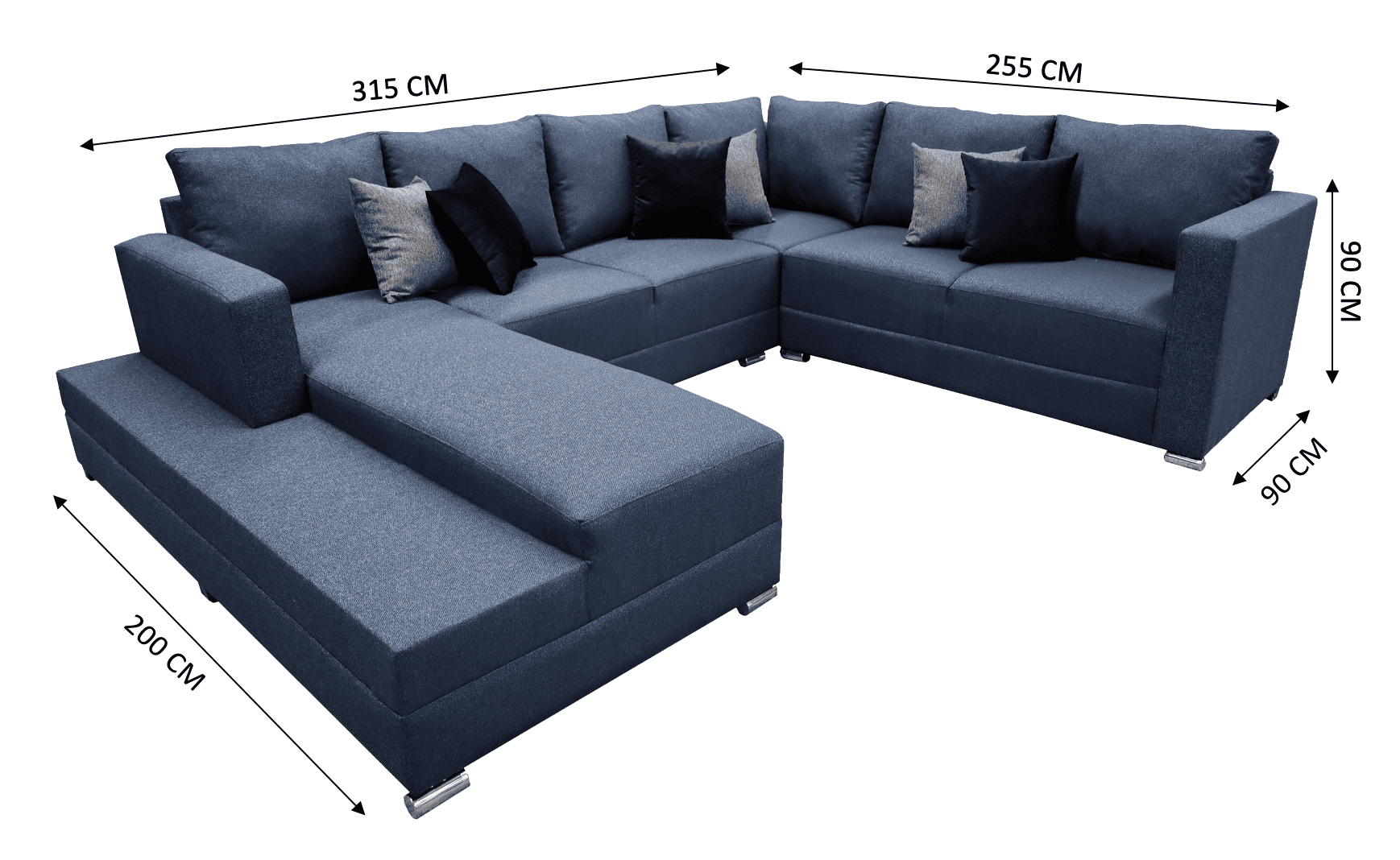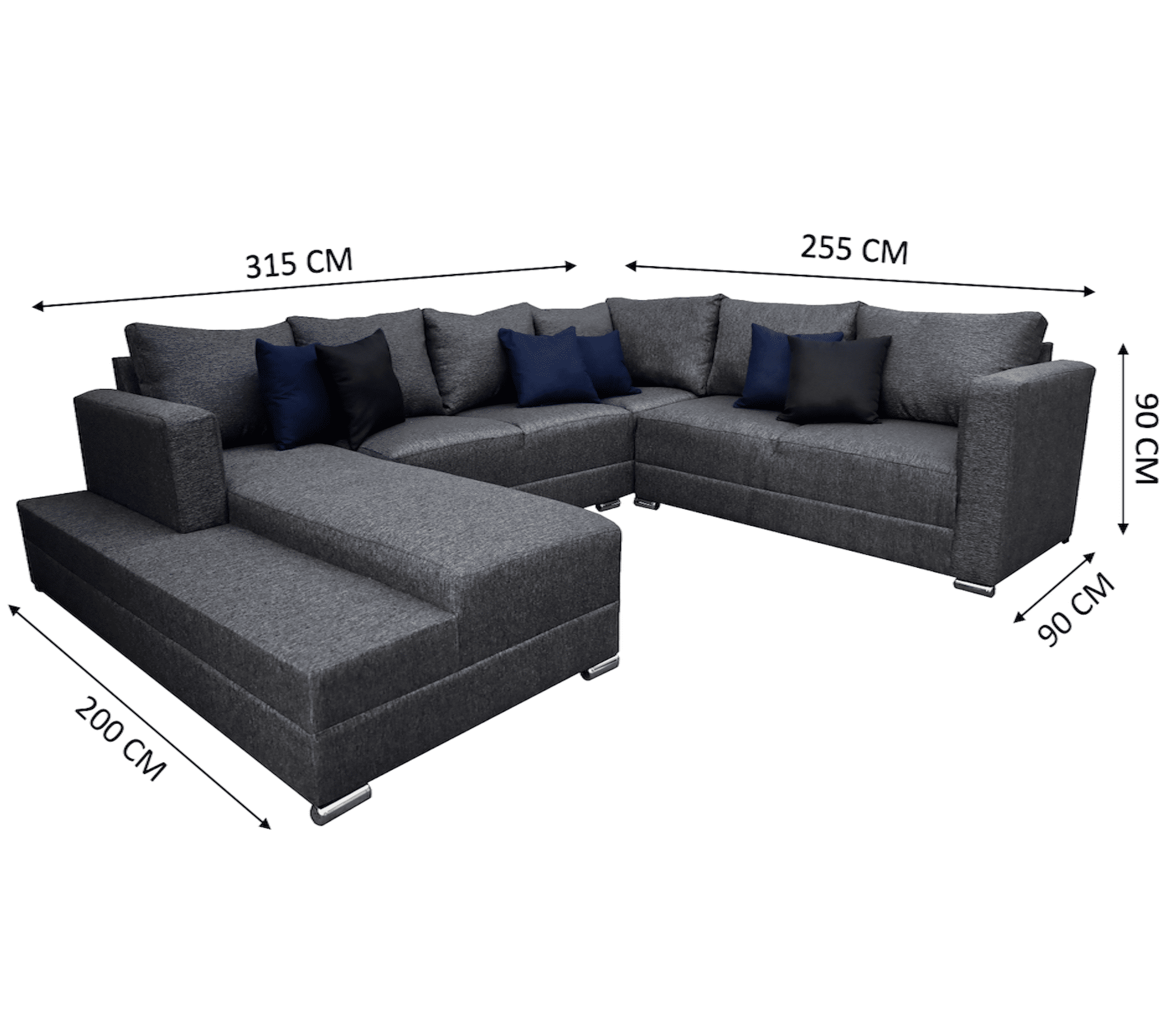 Medidas: Largo derecho 255 cm, largo frente 315 cm, largo izquierdo 200 cm, Profundidad 90 cm, Alto 85 cm